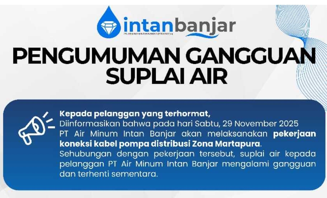 BANJARBARU, DETAK KALIMANTAN – PTAM Intan Banjar (Perseroda) melakukan penghentian sementara distribusi air kepada sejumlah pelanggan akibat dari pekerjaan koneksi kabel pompa distribusi di zona Martapura. Pelanggan yang terdampak dari pekerjaan tersebut meliputi wilayah Kabupaten Banjar dan Kota Banjarbaru.